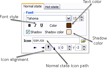 "Normal state" and "Hot state" tabs define how button responds to the mouse events. Icon alignment is defined also. You can select text font, font size, font style (bold, italic, and underlined) and so on for each button state separately.
